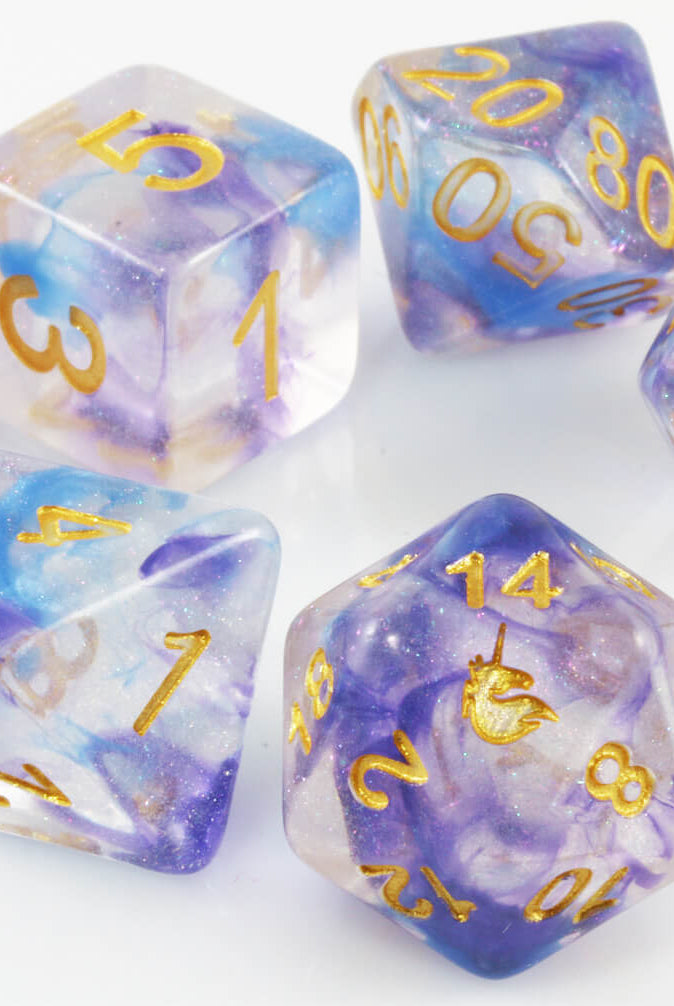 Unicorn dice come in complete 7-piece sets: d4, d6, d8, d10, d00, d12, and d20. These are amazing dice that help you along on your greatest adventures.