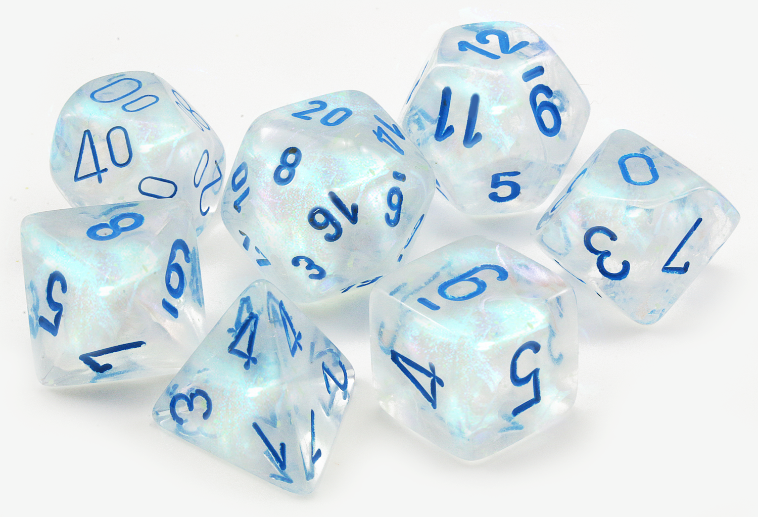 Borealis Luminary dice have all the classic polyhedral shapes you need: d4, d6, d8, d10, d00, d12, and d20. The dice are perfect for Dungeons & Dragons, Pathfinder, and all your favorite tabletop roleplaying games. Etched numbers are inked in light blue for easy reading after each roll-to-hit and saving throw.