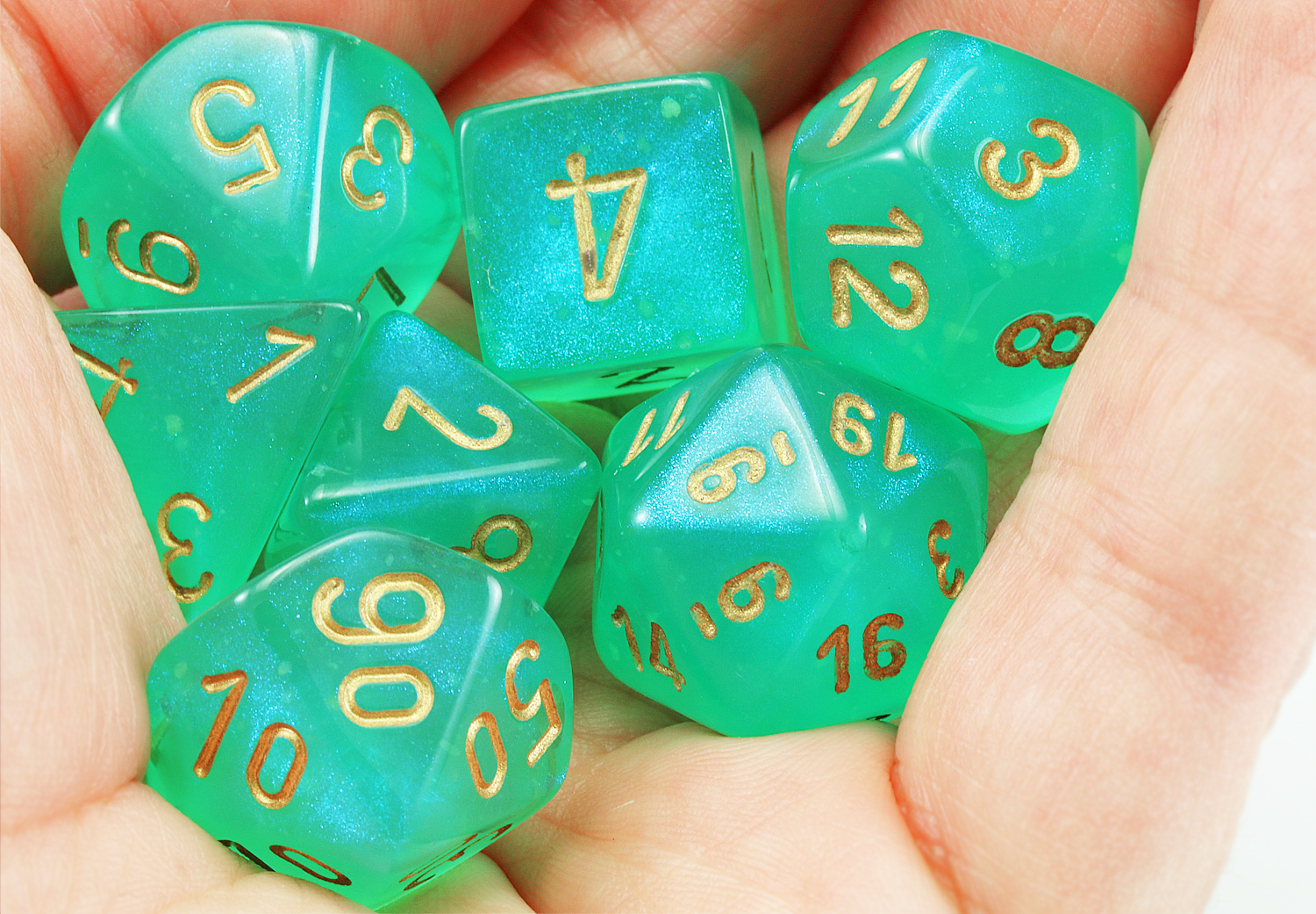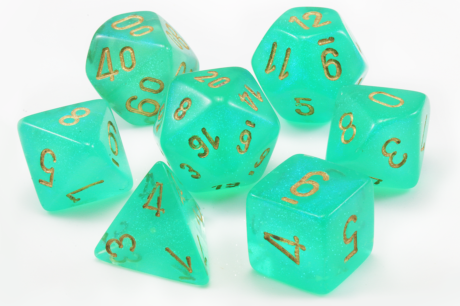 Borealis Luminary dice have all the classic polyhedral shapes you need: d4, d6, d8, d10, d00, d12, and d20. The dice are perfect for Dungeons & Dragons, Pathfinder, and all your favorite tabletop roleplaying games. Etched numbers are inked in gold for easy reading after each roll-to-hit and saving throw.
