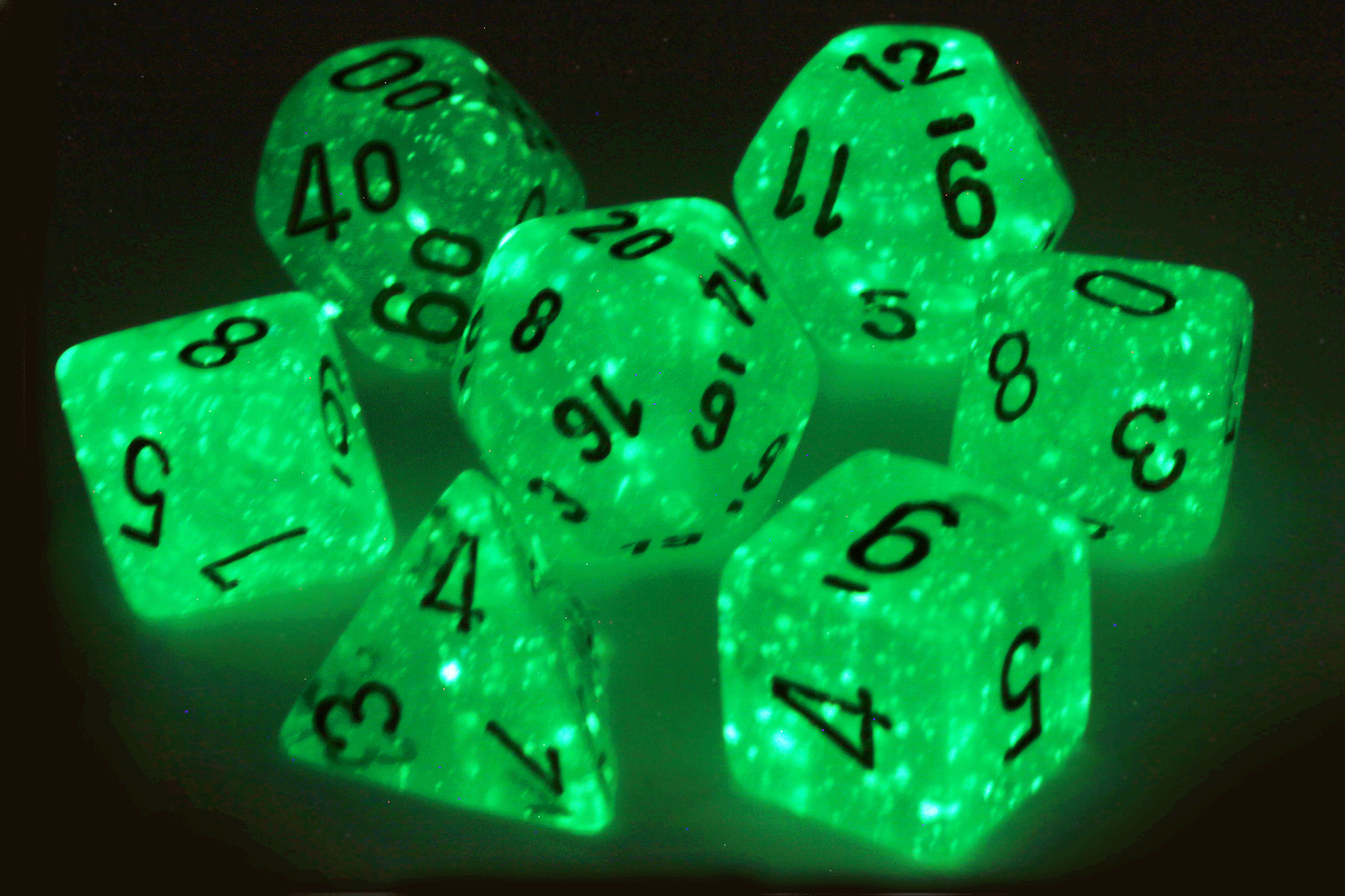 To get your dice to glow, you first need to charge them under a bright light. The longer and more intense the charge, the better the glow.