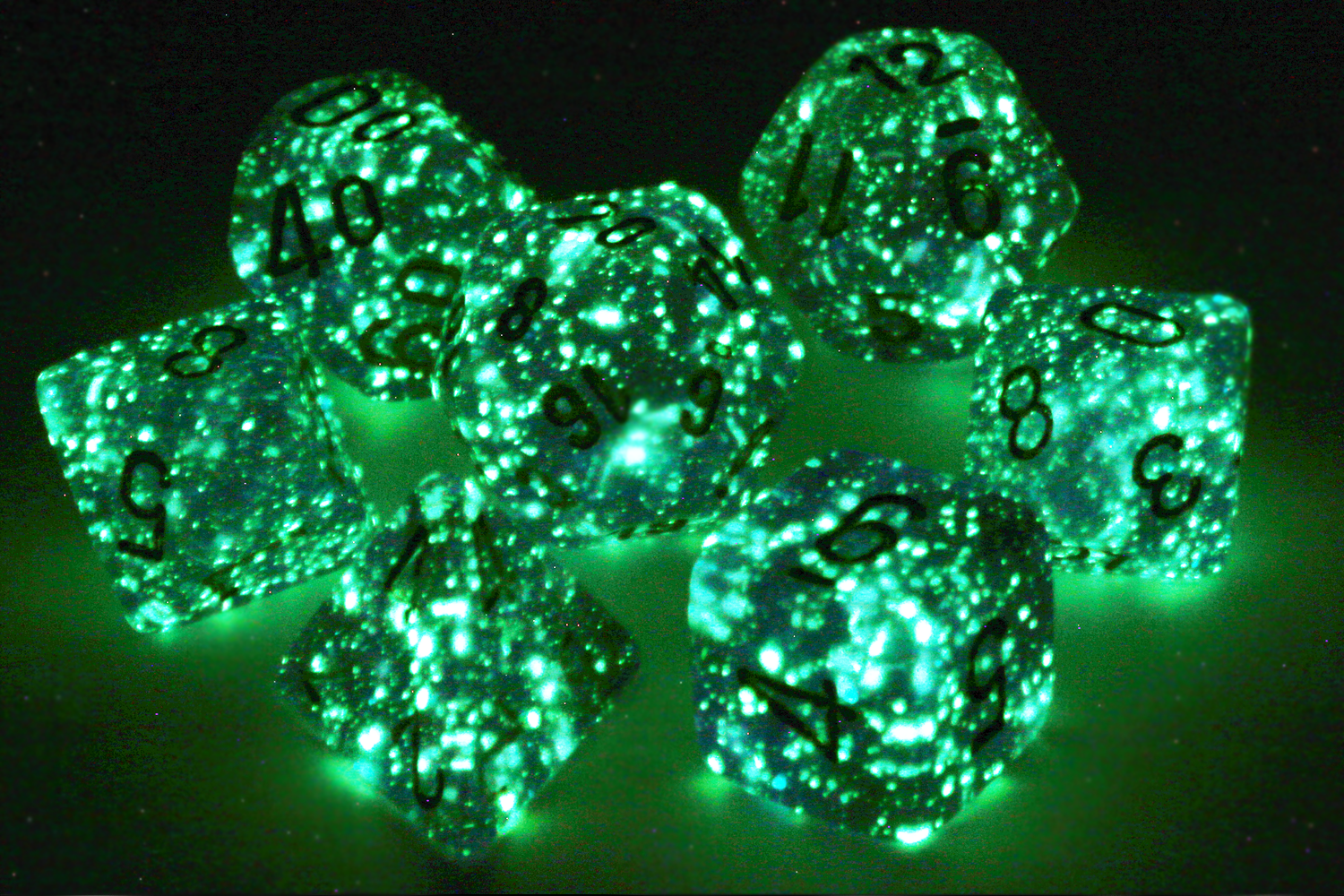 To get your dice to glow, you first need to charge them under a bright light. The longer and more intense the charge, the better the glow.