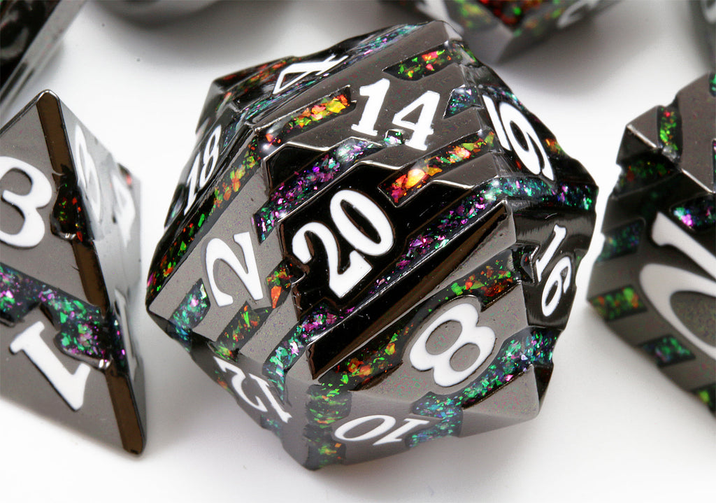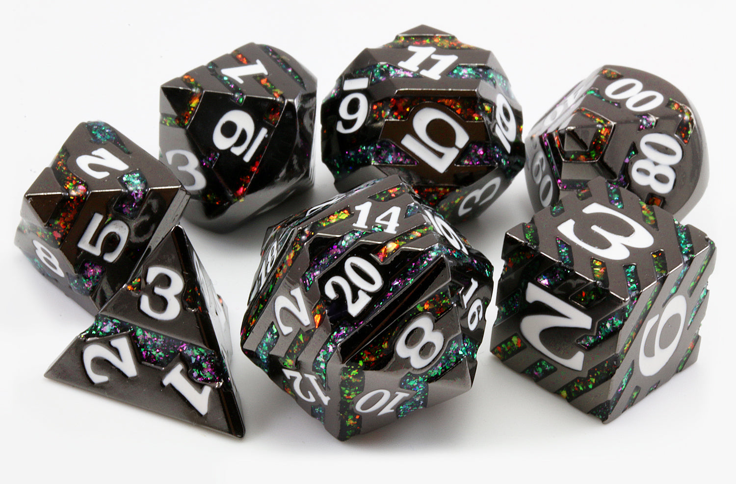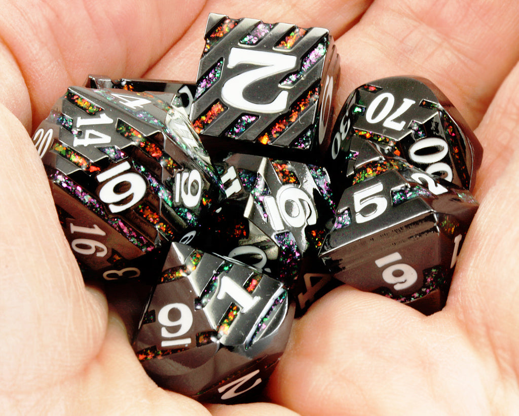 You never know where your tabletop roleplaying adventures will take you, so always be prepared! Combining the strength of metal with infused, prismatic layers, these dice are breathtakingly beautiful. Comes complete in a traditional 7-piece polyhedral set: d4, d6, d8, d10, d00, d12 and d20. Amazing dice for Dungeons & Dragons, Pathfinder, and all the best tabletop role-playing games.