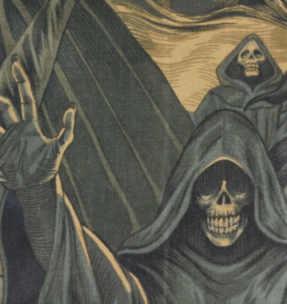 The Haunted dice bag will keep you up at night! Ghostly images of wraiths, skeletons, bats, ravens, undead horses and more await you. This deluxe dice bag is made of cotton fabric with a silky, black satin lining for premium dice protection. Double-wrap, drawstring cords make for an easy, snug closure to prevent the loss of your favorite gaming dice during transport.