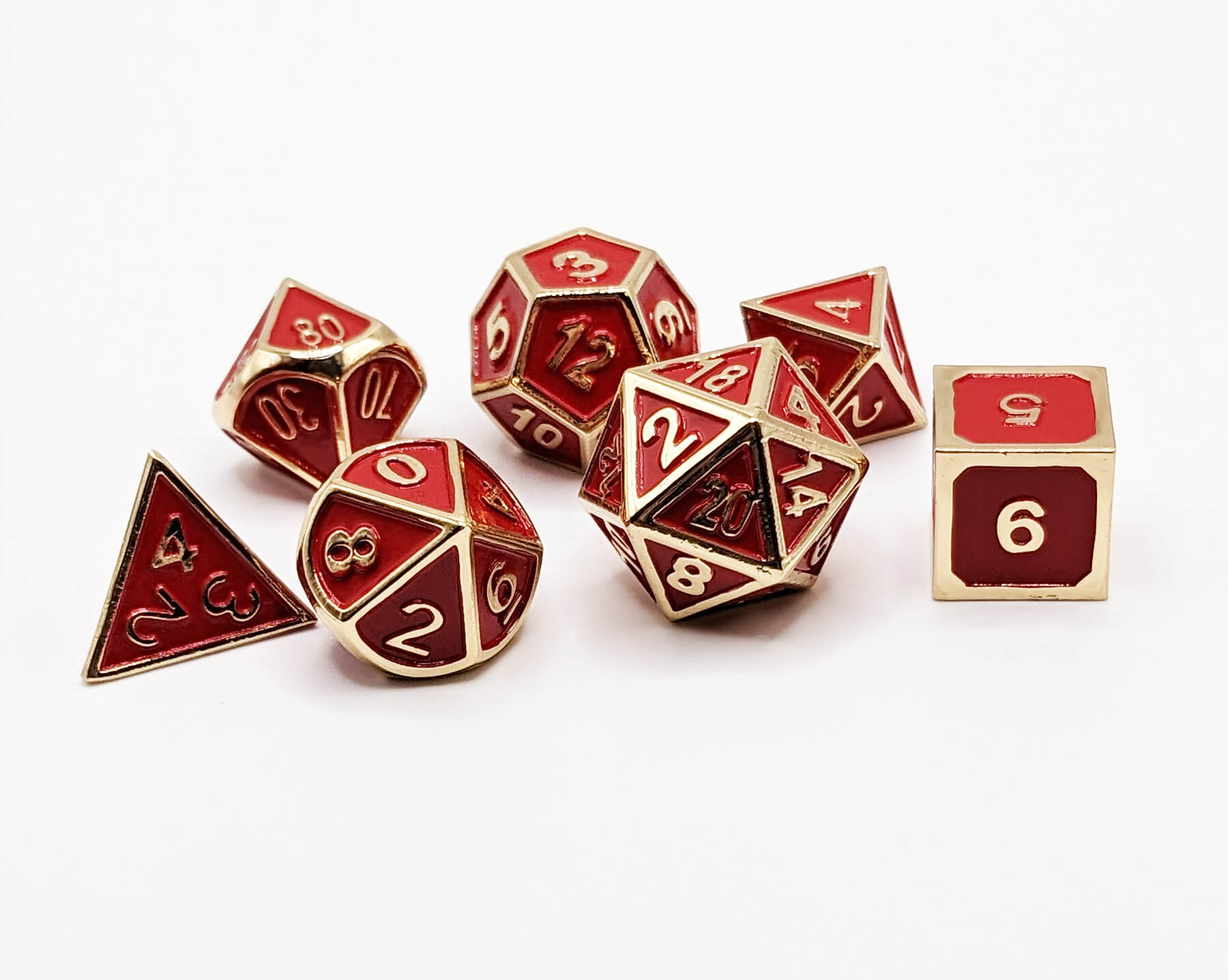 Roll in style with a set of premium metal dice. These gorgeous dice have a filled inlay of durable, red resin. You'll love the rich, full color and the irresistible feel of these heavy dice in your hand. Comes complete in a traditional 7-piece polyhedral set: d4, d6, d8, d10, d00, d12 and d20. Amazing dice for Dungeons & Dragons, Pathfinder, and all the best tabletop roleplaying games.