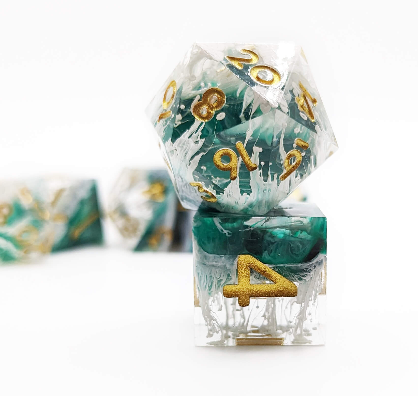 Sharp Edge Inclusion Dice are carefully handcrafted from beautiful resin. The Lost World set is crafted in crystal clear with a gorgeous green and cloudy inclusion effect. The numbers are inked in a rich gold color. Gamers will be hard-pressed to find game dice more breathtakingly beautiful!